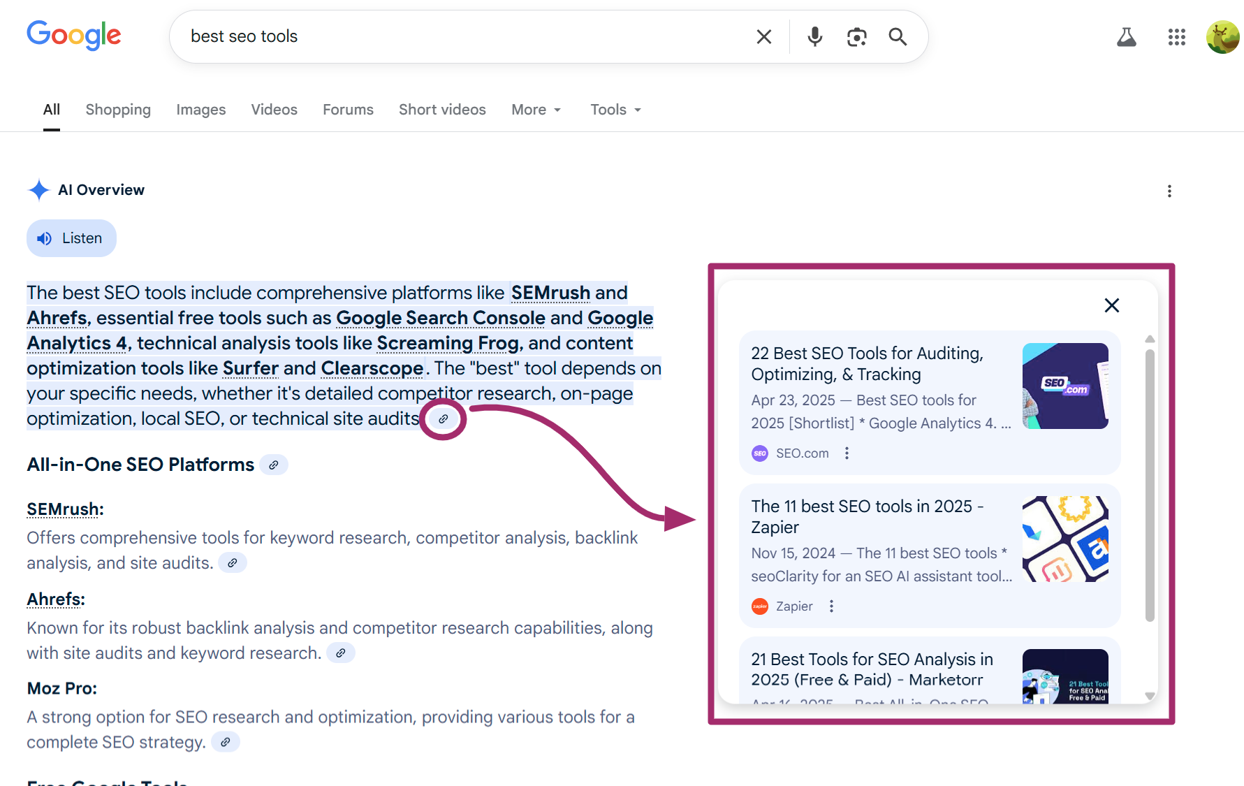 | Selection factors | Determined by domain authority, anchor text, and contextual relevance | Google AI Overviews, citing your blog |