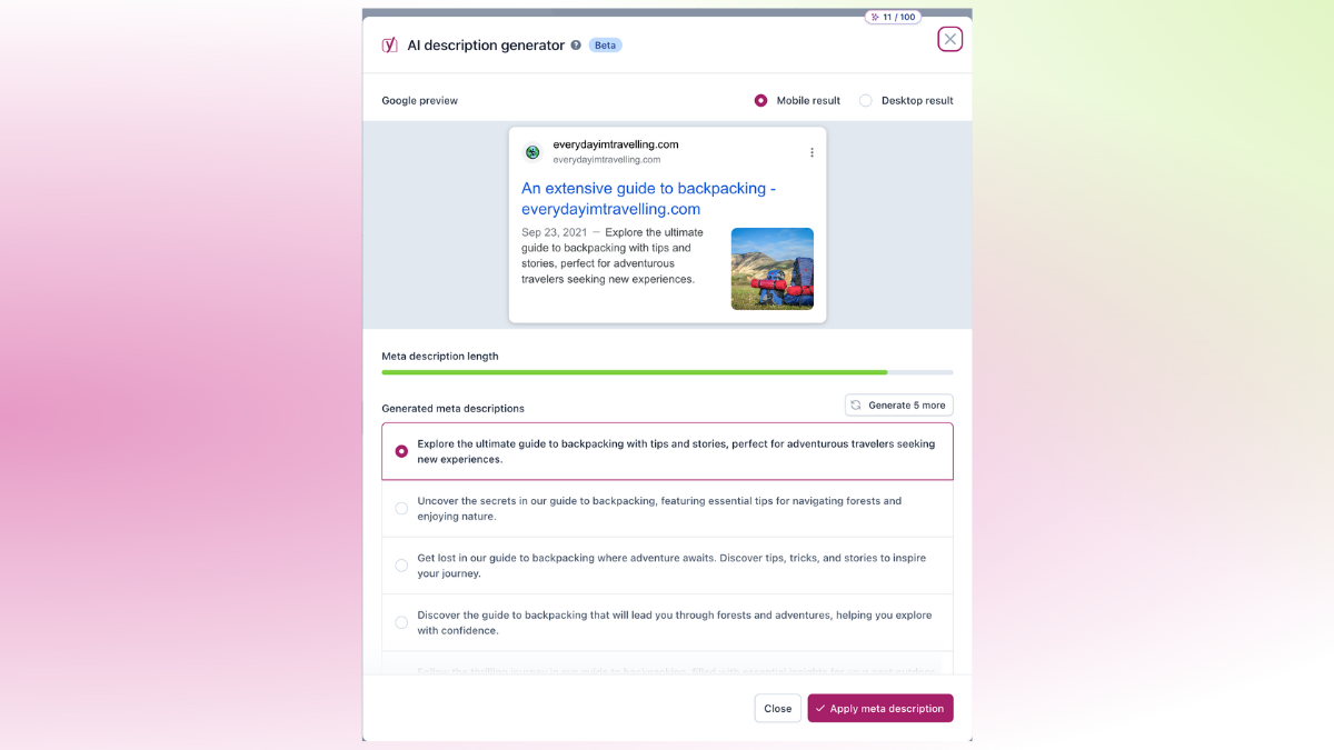 Yoast SEO’s AI feature empowers you to create effective, engaging titles and meta descriptions at the click of a button. It combines advanced AI technology with Yoast’s linguistic expertise, saving you time and kickstarting your SEO processes!