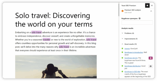 - Publish daily at ease: Works in 20+ languages and lives in the WordPress editor you already use. Optimization happens alongside writing, not after. You can also optimize in your Google Docs using the Yoast SEO Google Docs Add-on with Advanced SEO and Readability Analyses.