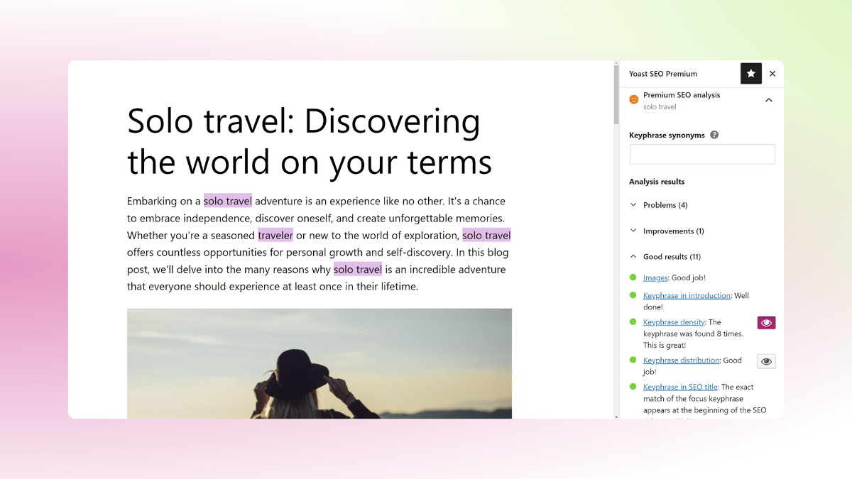 It scans your draft, spots thin topic coverage, understands variations of your keyphrase, shows the current internal link count, and more. Then it tells you exactly what to tighten, so you spend less time guessing and more time shipping pages people actually find.