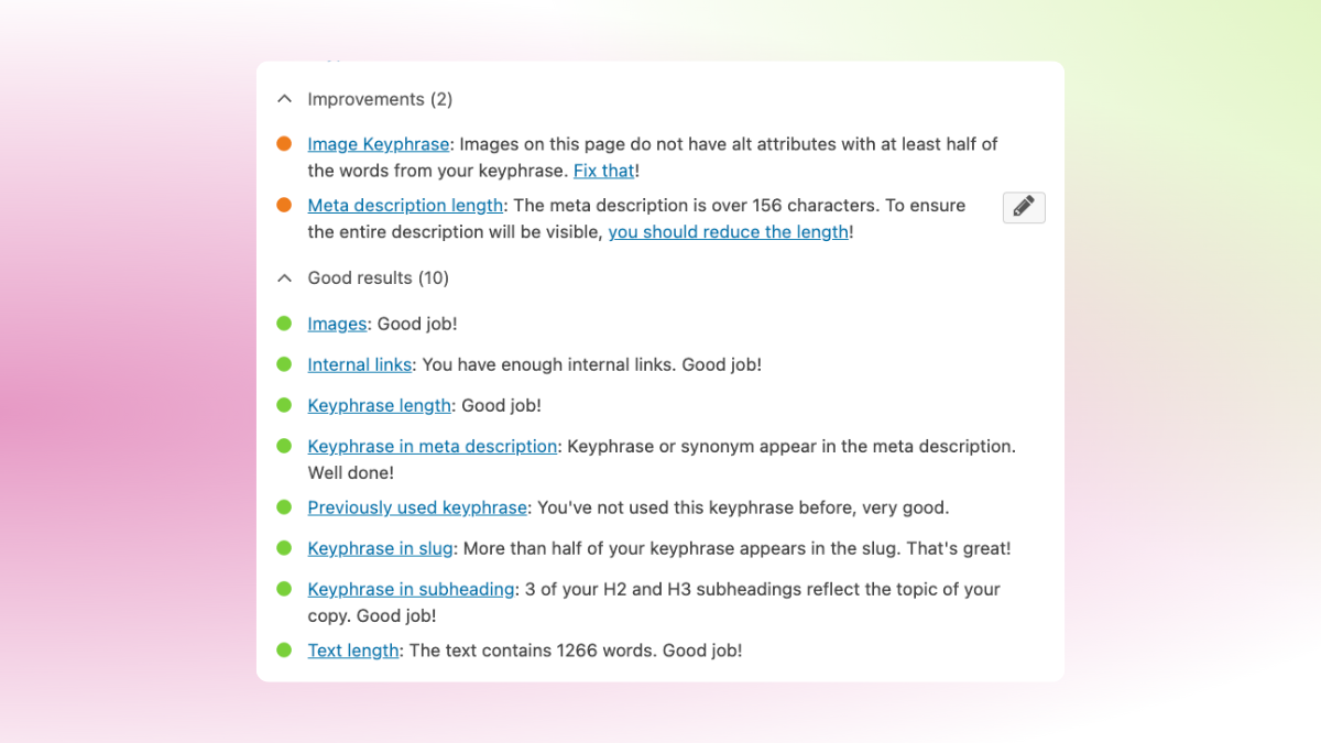 Write your page. The analysis reads it, highlights gaps around your keyphrase and related terms, displays the number of internal links on the page, and more. You make the edits that truly matter and move on.