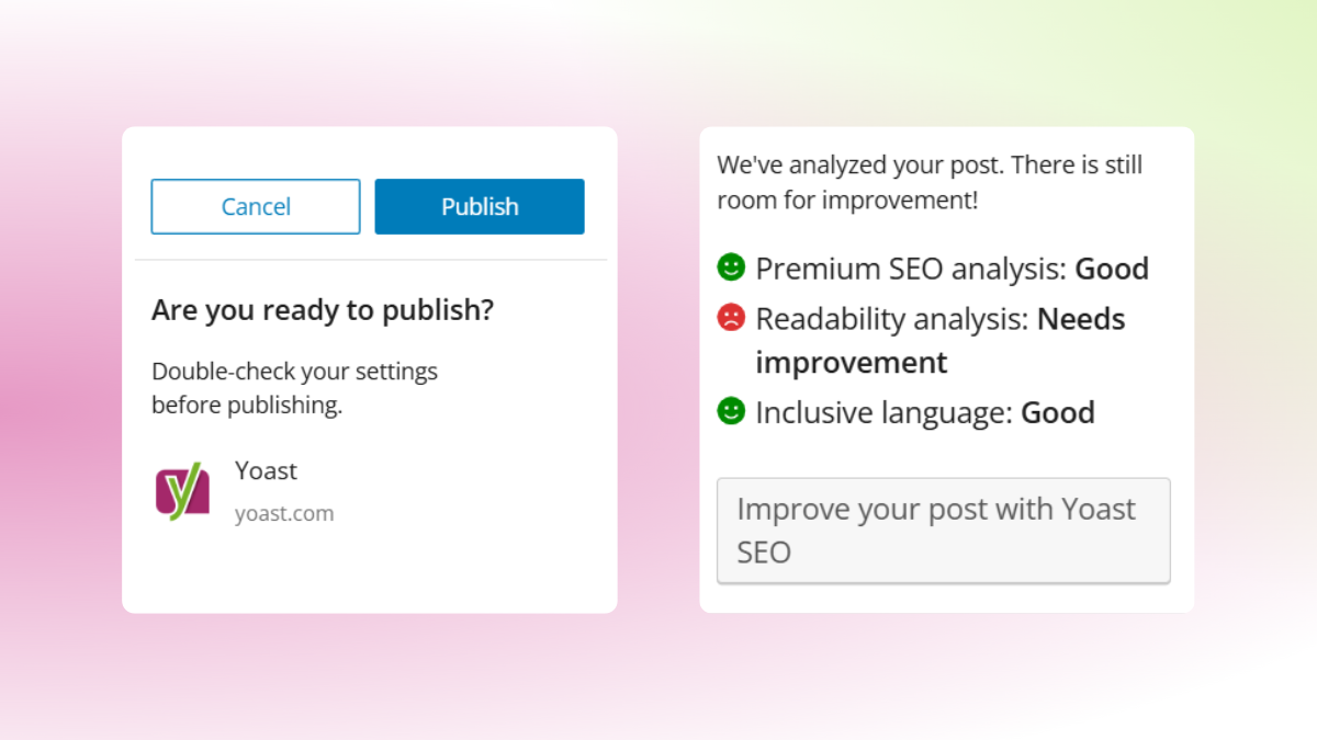 Ship content that is easier to discover and more compelling to choose. Yoast SEO Premium provides in-editor guidance that highlights areas for improvement, explains why they matter, and offers step-by-step instructions on how to fix them without slowing your workflow.