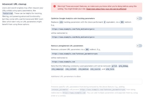 If your site relies on query parameters for key functionality (or tracking), then automatically removing these might obviously cause problems. If you enable this feature, we recommend testing extensively to be sure that no critical query parameters are accidentally removed.