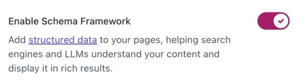 In the Schema menu, you can see what Schema API integrations are active, and enable the Schema Framework to automatically build a single, connected Schema graph for your site.