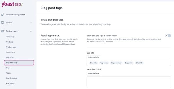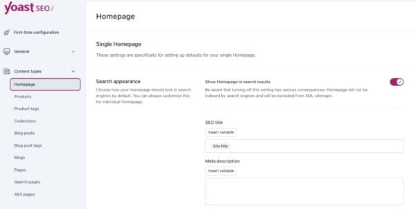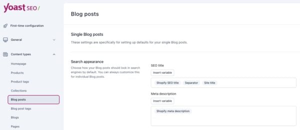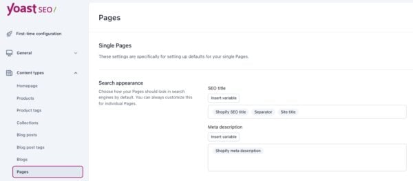 In the Search appearance section of the settings, you can set default templates for the SEO title and meta description for the various content types. You can also use snippet variables to create default SEO title and meta descriptions. However, remember that these templates should be a backup. The best way to add the SEO title and the meta description is when you edit a single page.