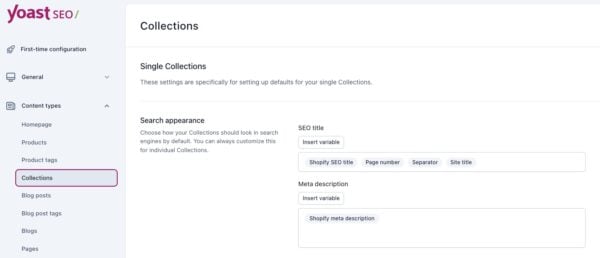 Shopify has different content types, such as products, blogs, collections, pages, etc. In Yoast SEO, there are settings that help you improve the search appearance of these content types. This article will give you an overview of the Content types settings in Yoast SEO for Shopify and show you what URLs they target. You can find the content types settings in the Settings tab of the Yoast SEO app.