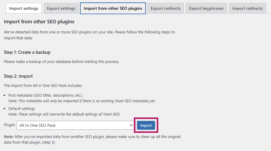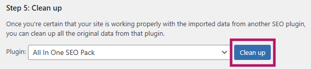 After finishing the First-time configuration, select Step 5 of the Import from other SEO plugins process. This step will clean your old data: you will receive a notification when it is complete.