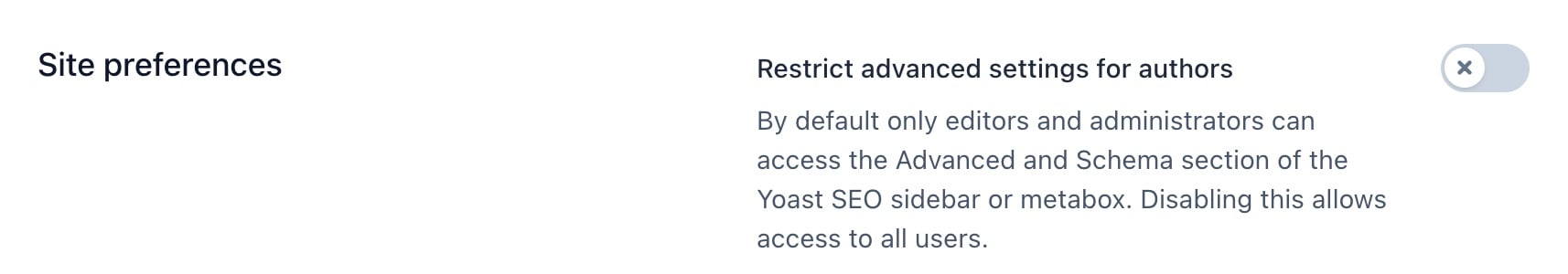 This feature lets you determine who gets access to the Advanced tab of the Yoast SEO meta box and the Yoast SEO sidebar. In the Advanced tab, you find the settings that allow you to remove posts from the search results or change the canonical. These are powerful settings, and, as such, it is advisable to let only specific users access them. That is why, by default, only editors and administrators can see and use the Advanced tab in Yoast SEO.