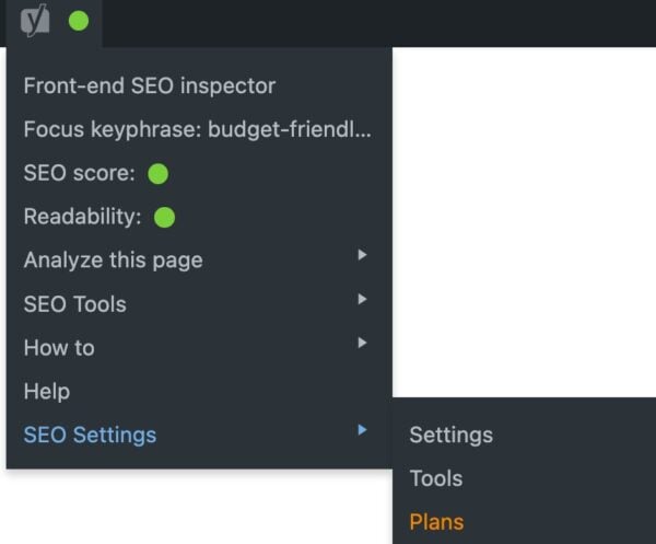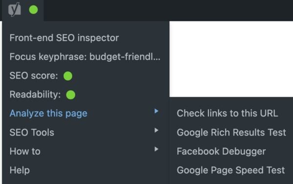 When you are logged in to your WordPress account and view or preview a page on the front-end, you will additional items in the Yoast SEO admin bar menu.