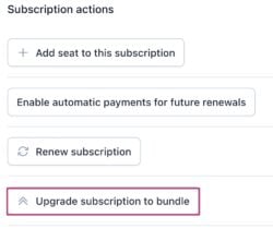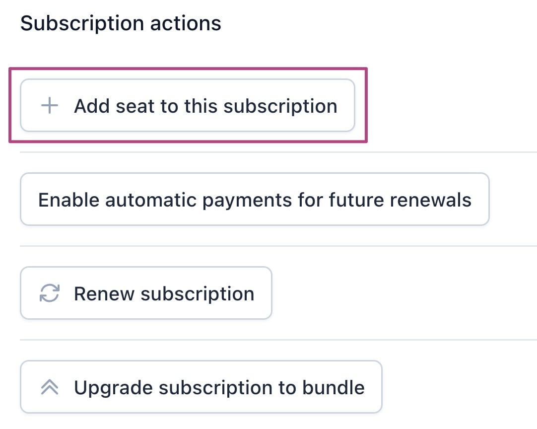 Find the subscription you want to upgrade and click Manage. - Under Subscription actions, click Add seat to this subscription