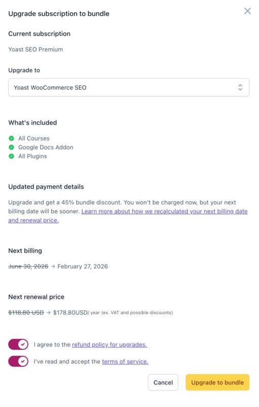 In the pop-up screen, you’ll see the details of the upgrade, including your current subscription, upgrade options, next billing date and next renewal price. Tick the boxes to agree to the upgrades refund policy and the terms of service. Then, click on Upgrade to bundle.