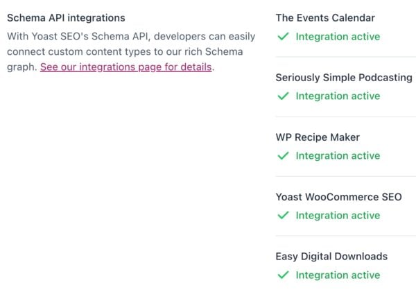 Under Schema API integrations you can find what Schema API integrations are active on your site. We offer Schema integrations for the following plugins: