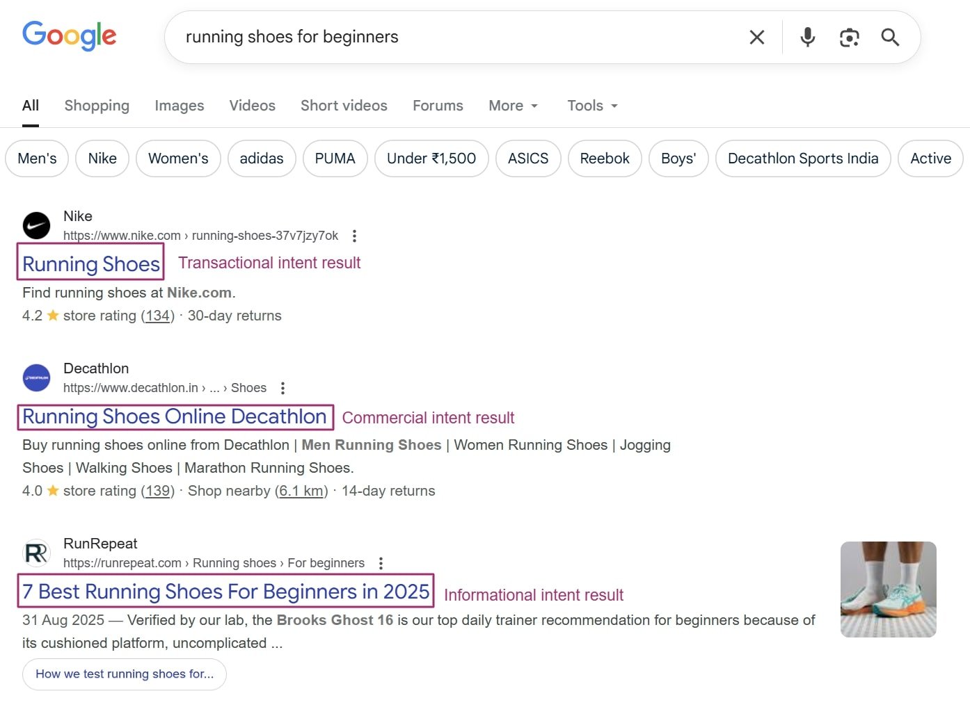 A more reliable way to understand intent is to study the actual search results. Google’s results page is one of the clearest sources of information you have. If the page features guides and how-to articles, the intent is usually informational; if you see reviews and comparisons, that suggests commercial investigation; and if product pages dominate, that is a strong signal of transactional intent.