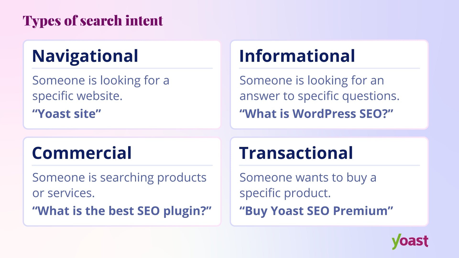 - Understand the four main types of search intent: informational, navigational, commercial, and transactional